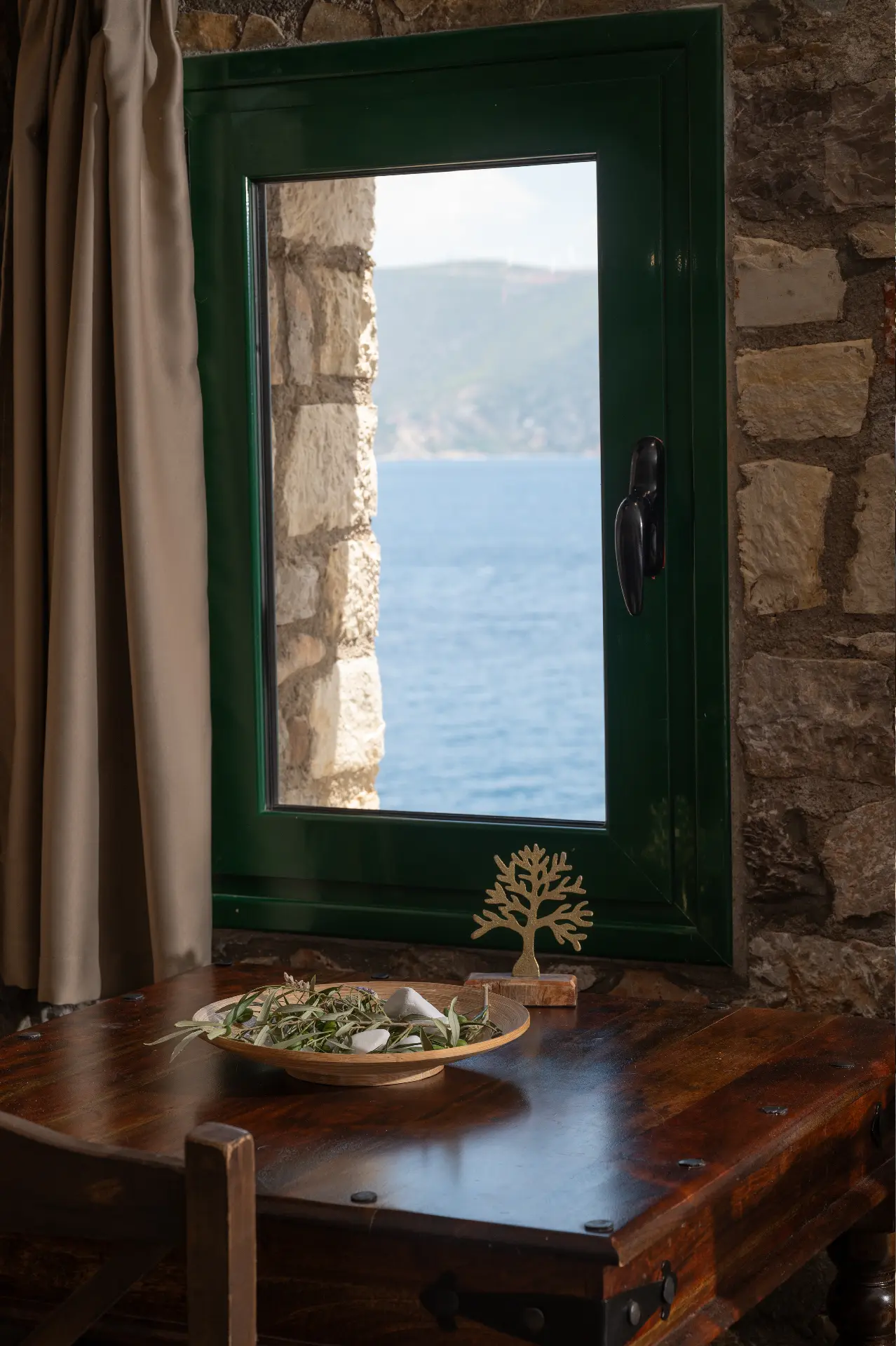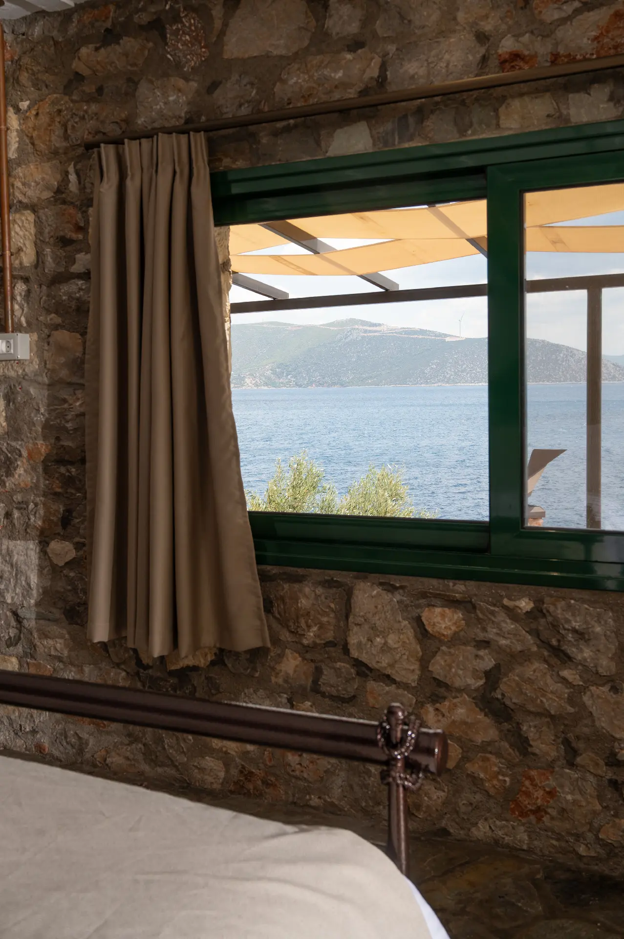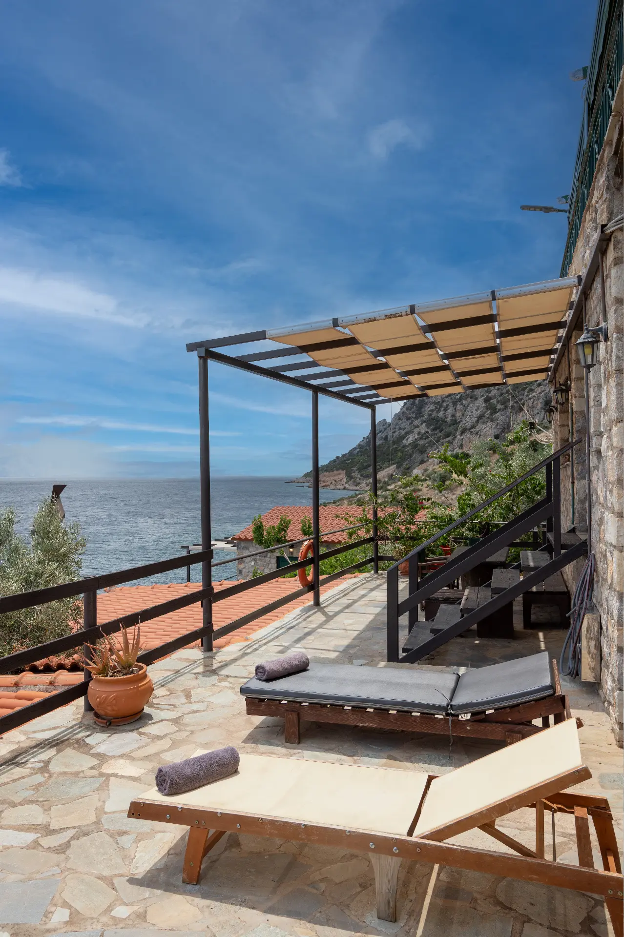 Διαθέτει ενιαίο χώρο, με ξύλινα έπιπλα και διπλό μεταλλικό κρεβάτι. Απολαύστε τη θέα και τον ήχο της θάλασσας από κάθε γωνιά του δωματίου. Εξοπλισμένη κουζίνα στον ενιαίο χώρο, που περιλαμβάνει άνετη τραπεζαρία. Μεγάλο μπαλκόνι στον απέραντο γαλάζιο ορίζοντα. Το διαμέρισμα διαθέτει εντυπωσιακούς πέτρινους τοίχους με χειροποίητες ξύλινες κατασκευές καθώς και πολυτελές μπάνιο με ντουζιέρα.