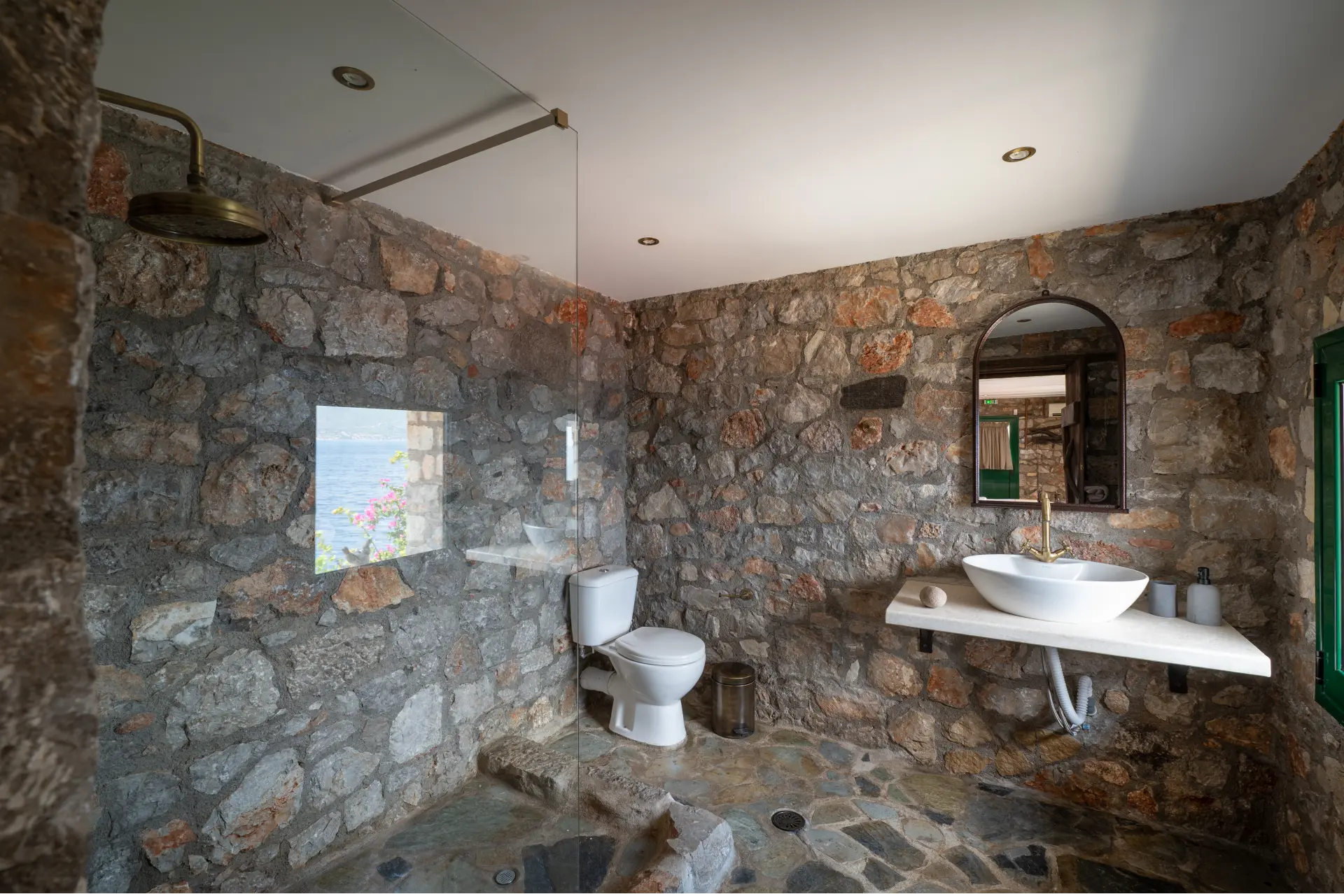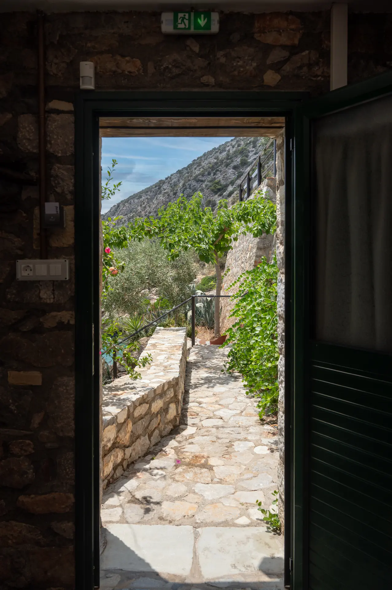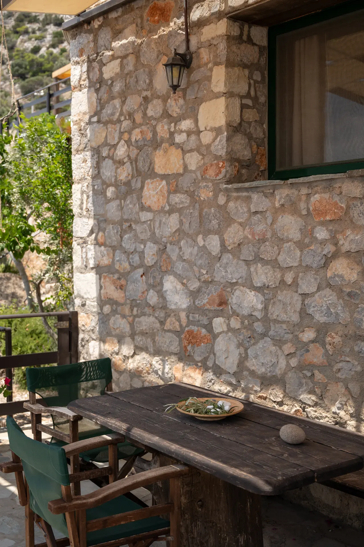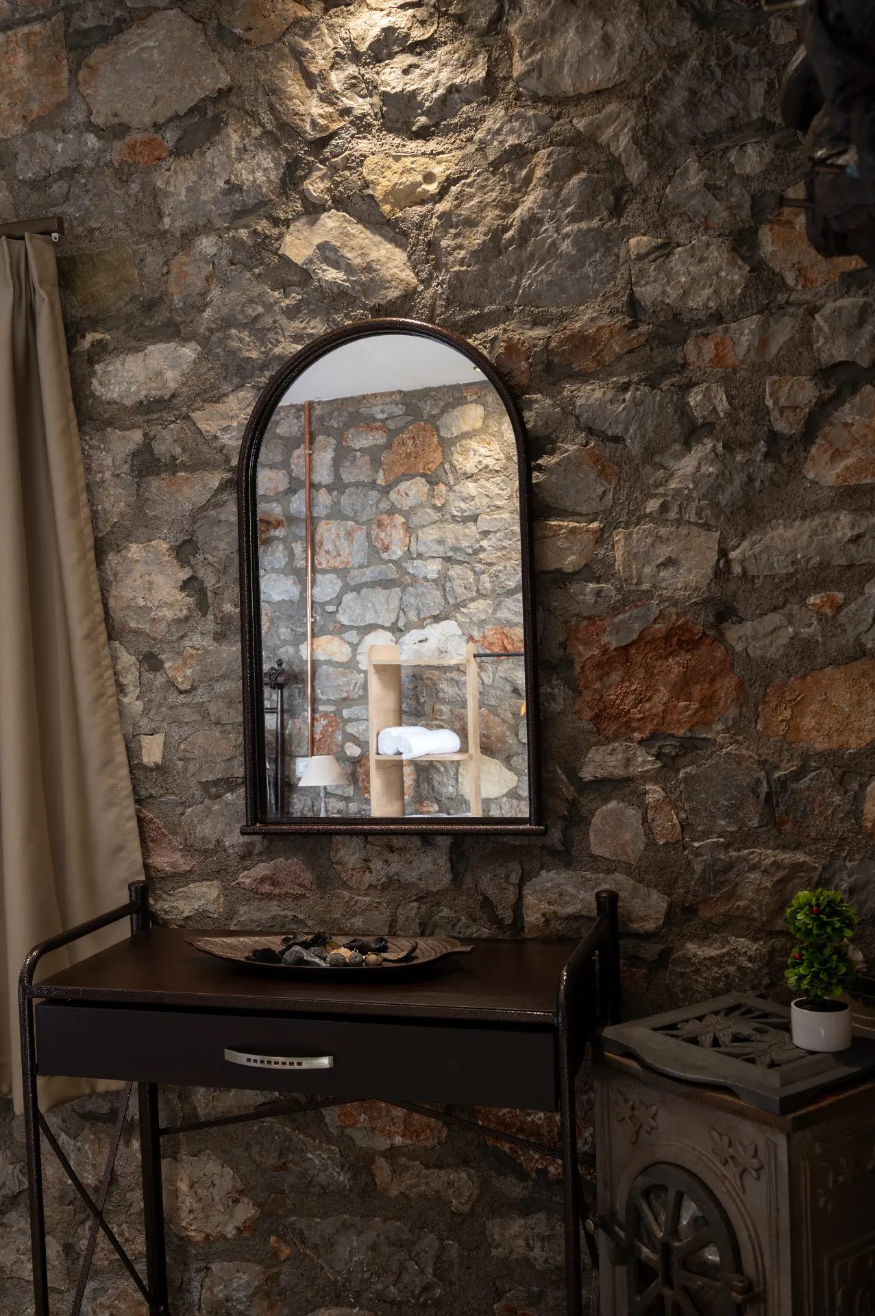 Διαθέτει ενιαίο χώρο, με ξύλινα έπιπλα και διπλό μεταλλικό κρεβάτι. Απολαύστε τη θέα και τον ήχο της θάλασσας από κάθε γωνιά του δωματίου. Εξοπλισμένη κουζίνα στον ενιαίο χώρο, που περιλαμβάνει άνετη τραπεζαρία. Μεγάλο μπαλκόνι στον απέραντο γαλάζιο ορίζοντα. Το διαμέρισμα διαθέτει εντυπωσιακούς πέτρινους τοίχους με χειροποίητες ξύλινες κατασκευές καθώς και πολυτελές μπάνιο με ντουζιέρα.