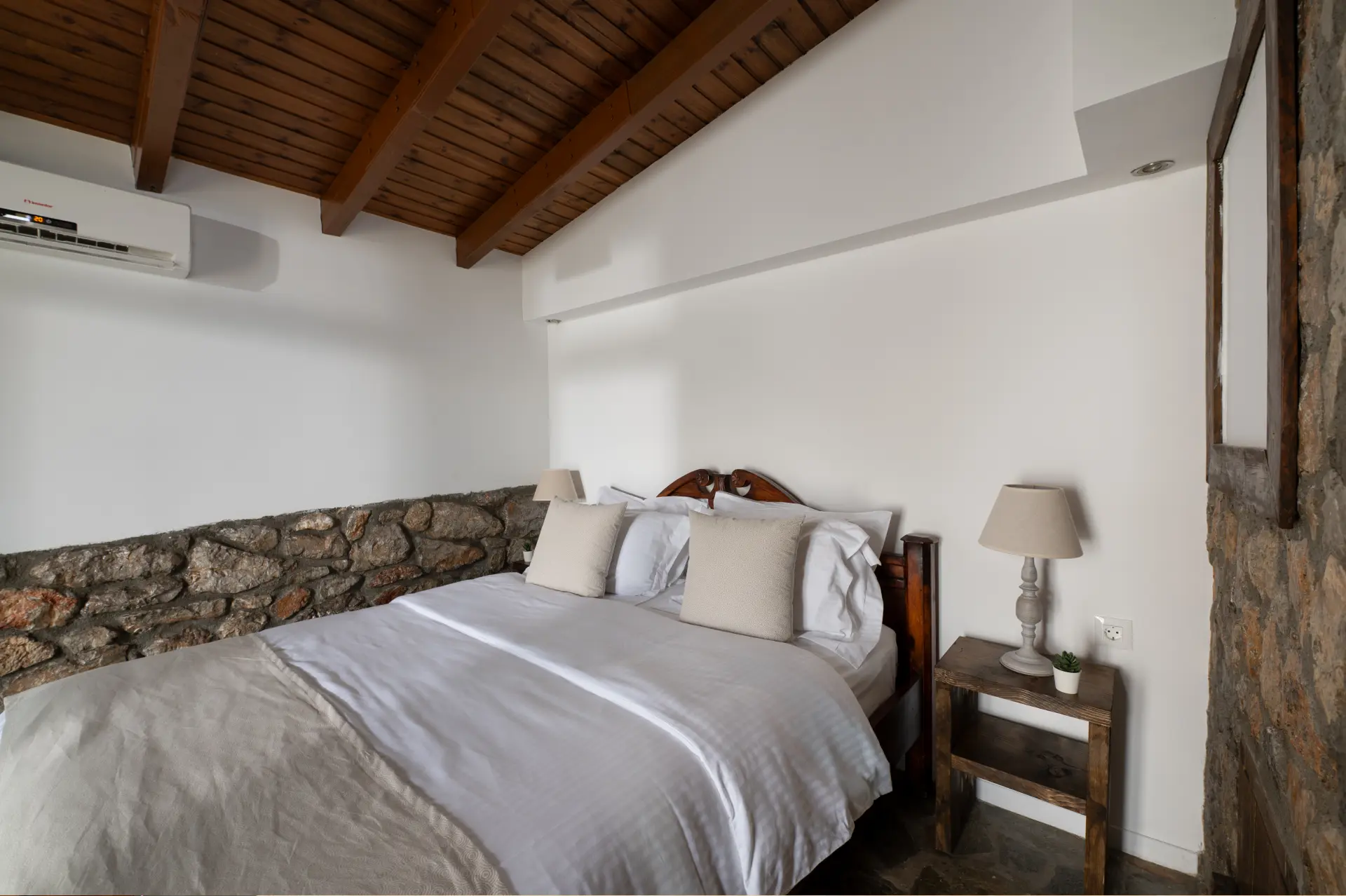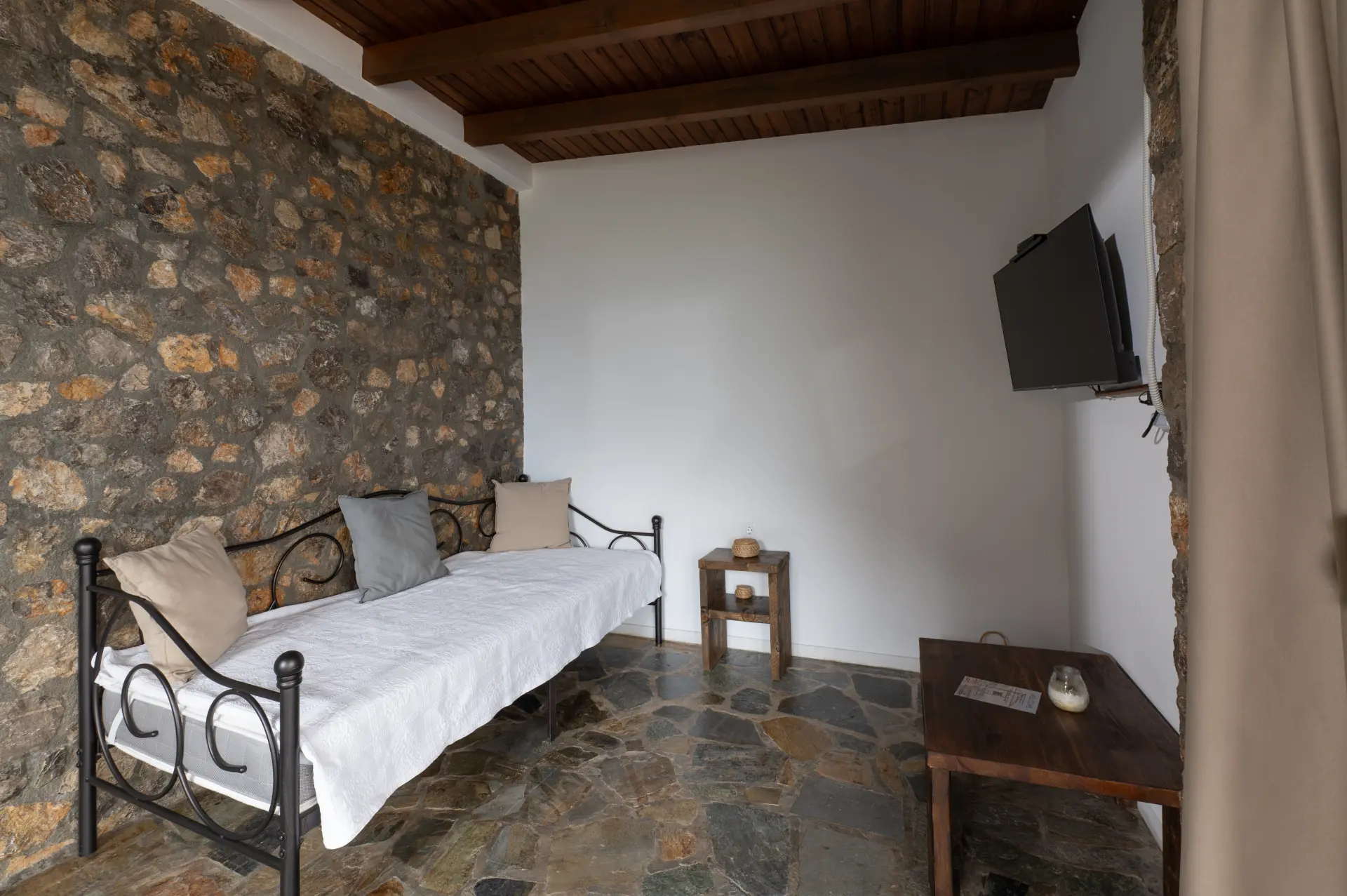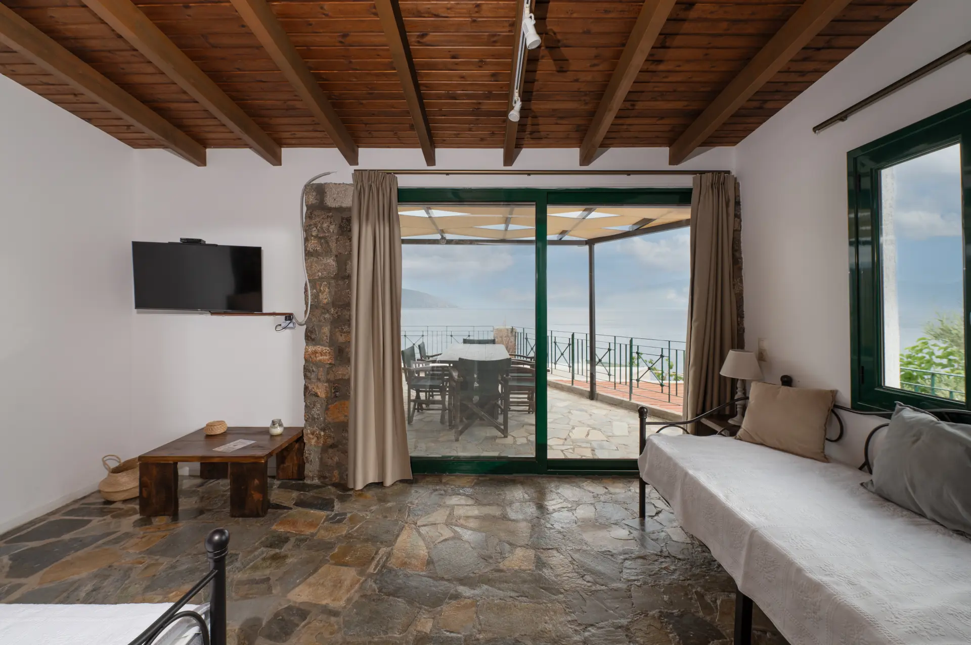 Το διαμέρισμα διαθέτει εντυπωσιακούς πέτρινους τοίχους και χειροποίητες ξύλινες κατασκευές. Έχει μια πραγματικά τεράστια βεράντα με θέα τα χρώματα του ηλιοβασιλέματος.