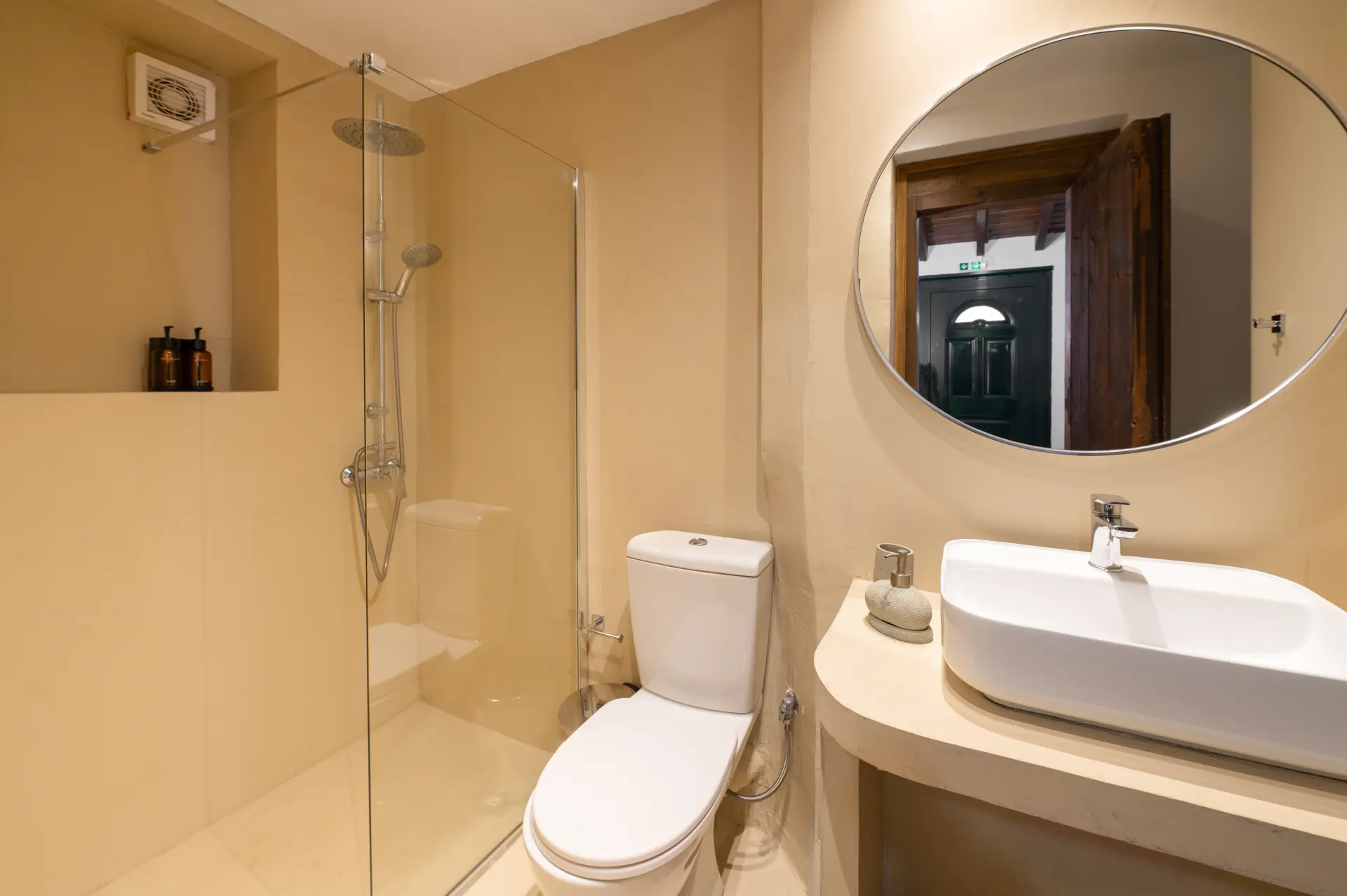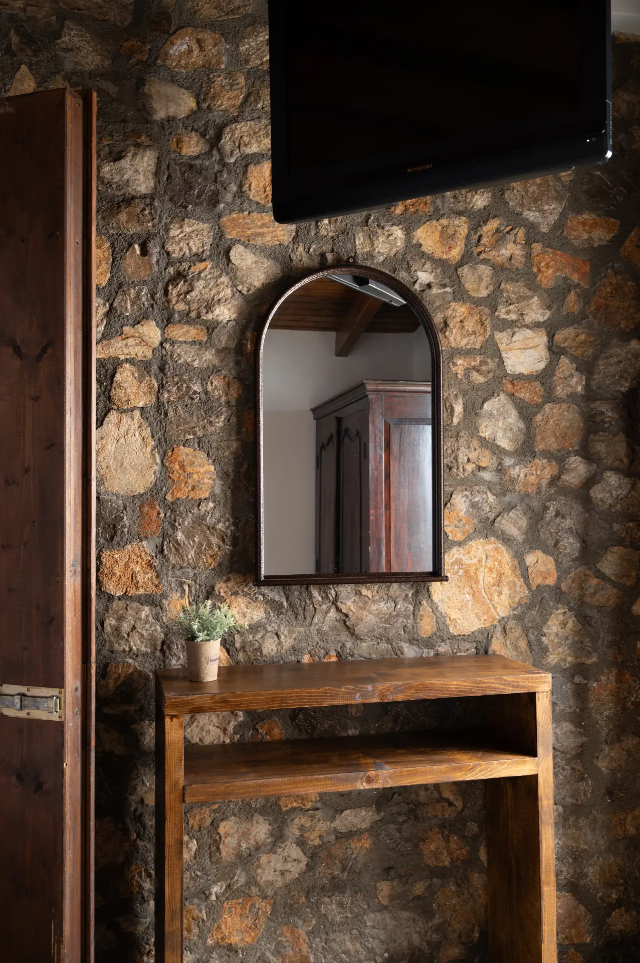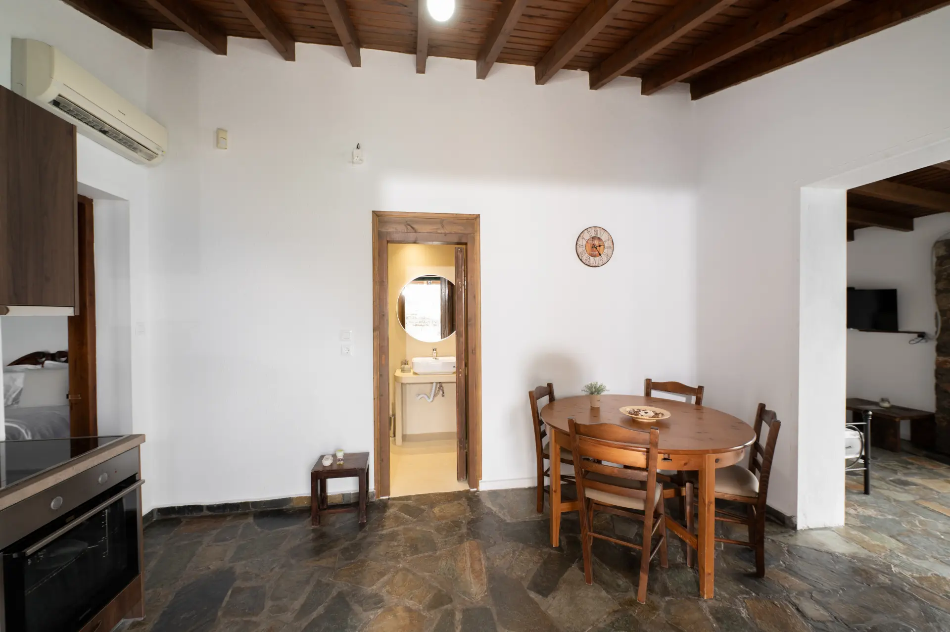 Το διαμέρισμα διαθέτει εντυπωσιακούς πέτρινους τοίχους και χειροποίητες ξύλινες κατασκευές. Έχει μια πραγματικά τεράστια βεράντα με θέα τα χρώματα του ηλιοβασιλέματος.